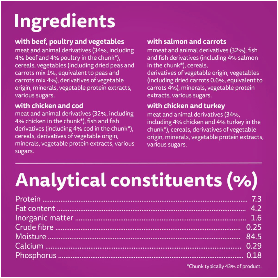 Wet cat food with delicious flavour sensations combining proteins and vegetables in a delightful mix guaranteed to make your cat purr. Cat food pouches with everything your cat needs to help keep them healthy, including B vitamins and balanced minerals.Adult cat food containing four sensational recipes: Beef & Poultry with garden vegetables, Salmon & carrots, Chicken & Whitefish, Whitefish & garden vegetables. Cat food that provides 100% of your cat's daily needs. We are committed to reducing our environmental impact. Fish in our wet cat food recipes is sustainably sourced.