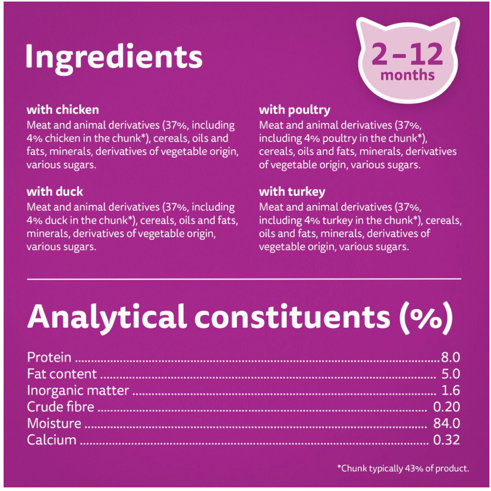 Each delicious wet cat food recipe is made with 100% high quality ingredients and is formulated to provide 100% of your kitten's daily needs. Cat food pouches with essential vitamins, Taurine to promote strong natural defences, and calcium to help build strong bones and teeth. Kitten food with smaller pieces designed for smaller mouths, and with high quality protein to ease digestion. Kitten food suitable from 2 months to 12 months of age. We are committed to reducing our environmental impact. 85% of our factories in Europe use renewable electricity and we’re working to move to 100% by 2025.